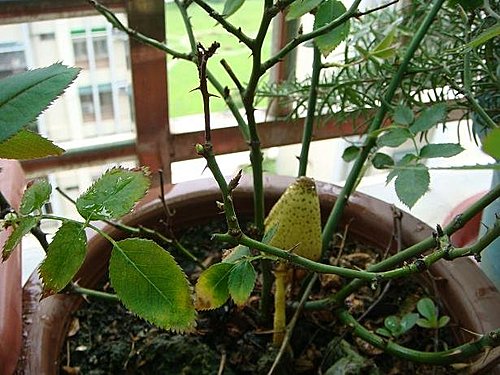 今天早上,為陽台上的花澆水時意外發現玫瑰花盆裡有一朵淡黃色的菇,不知道是否有毒,但卻是很大的驚喜.