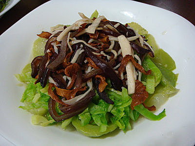 熱鍋後首先將雞油菌菇進鍋爆炒一下子,接著將切好的杏鮑菇絲和木耳絲放進去一起炒熟後盛起,將芥菜入鍋加些許水和鹽調味後盛盤,將剛剛炒好的三絲放在芥菜上就完成了一道顏色豐富又健康好吃的芥菜雞油菌菇.